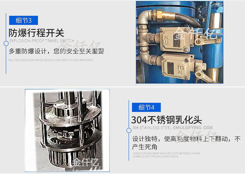 乳化機外觀采用色澤鮮艷,硬度好,耐磨性強的錘紋漆,讓外形更加美觀,更顯檔次;內(nèi)部選高質(zhì)材料,質(zhì)量結構牢固,經(jīng)久耐用;升降系統(tǒng)采用:液壓升降,升降旋轉(zhuǎn)自如,適應各種位置。主軸回轉(zhuǎn)速度有單速、雙速、三速及無級調(diào)速,配置變頻器,對電機實行變頻調(diào)速。電機為品牌防爆電機。